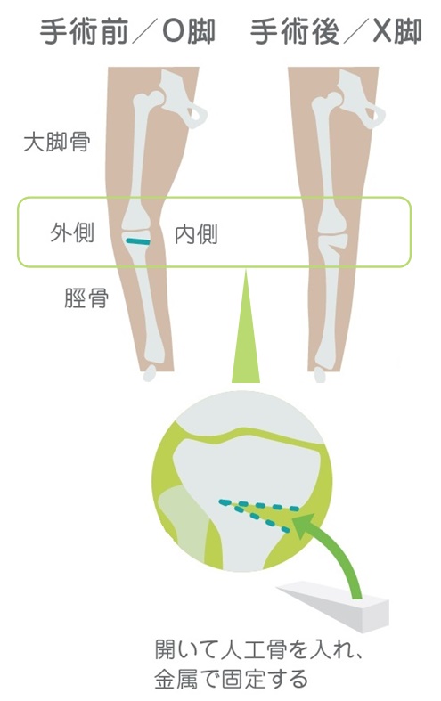 O脚変形のために膝関節内側に偏った過重なストレスを、膝関節外側に移動させる手術です。自分の骨を切り、少し角度を変えることにより、O脚変形を矯正します。人工関節手術と違い、自分の関節を温存する手術です。